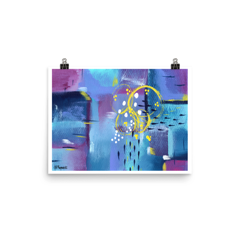 Delightful Junction bursts with playful energy, inviting the eye to dance across its vibrant surface. Cool shades of blue and purple create a soothing yet lively stage, while unexpected pops of pink and yellow add a spark of surprise. Bold yellow circles, lively and full of motion, ripple through the composition like cheerful invitations to join the fun. Scattered black and white accents weave through the canvas, adding a rhythmic beat that keeps the piece humming along. Blending soft, feathered edges with confident, textured brushstrokes, this abstract work balances a sense of calm with lively expression, making it an engaging conversation starter for any space.