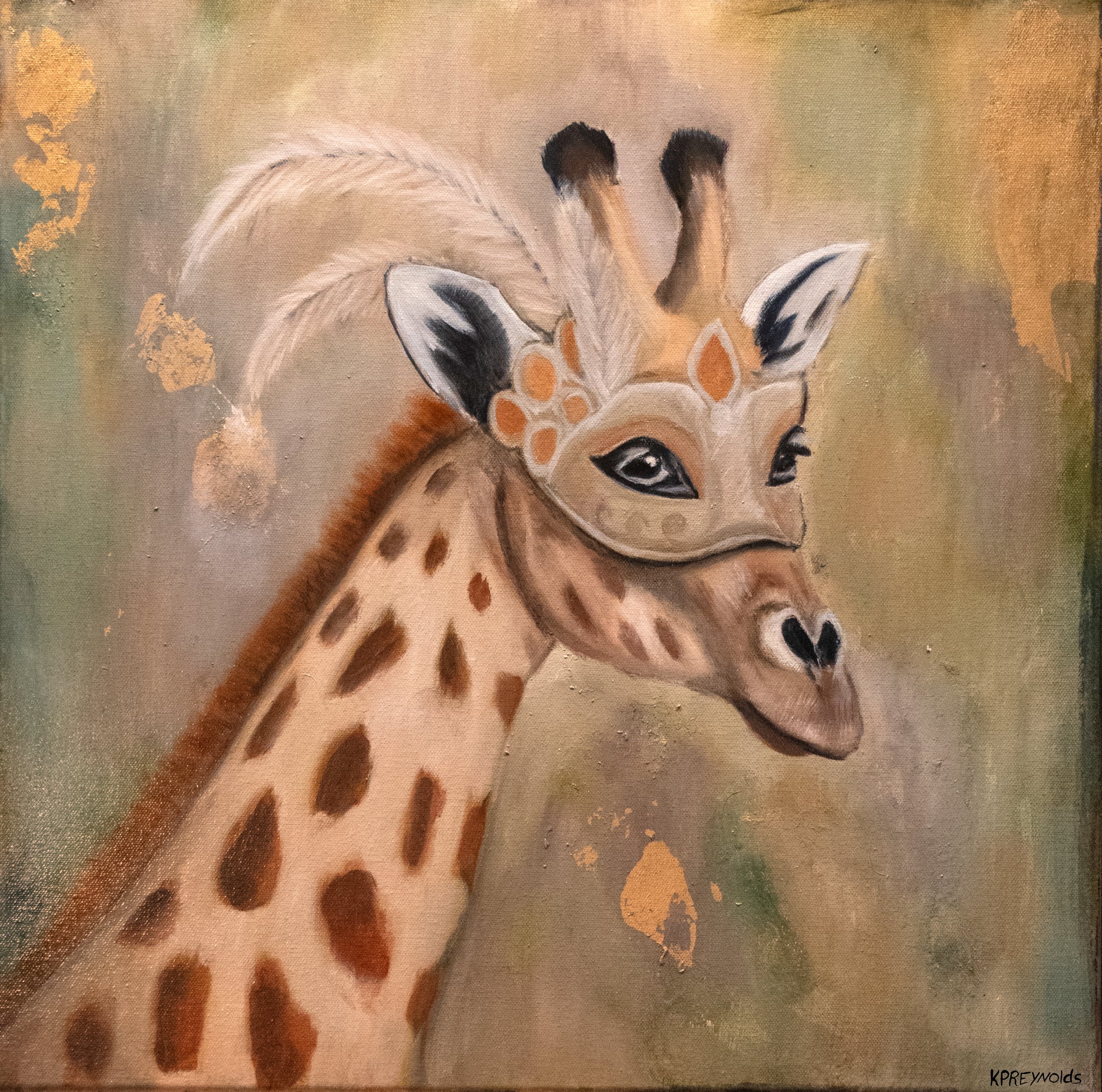 Feathered Grace is a 20x20 mixed media piece centered on a giraffe rendered in soft, earthy tones. The painting combines smooth brushwork and layered textures to highlight the animal’s distinctive markings and elegant form. At its heart, the giraffe’s face is transformed by an ornate mask that echoes its natural patterns, enriched with black, white, and orange accents. Above this, delicate white feathers rise, introducing a sense of whimsy and quiet majesty. The muted green, brown, and gold background grounds the composition, enhancing its warm, natural atmosphere. The addition of gold leaf subtly elevates the surface, catching light and adding depth to this contemplative yet playful work.