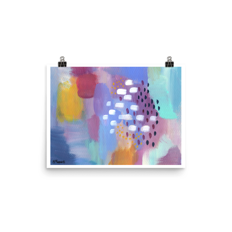Untroubled Renewal invites you into a refreshing dance of color and texture, where cool blues and purples set a tranquil stage that’s immediately brightened by lively splashes of yellow and orange. Soft, sweeping brushstrokes create a gentle, flowing backdrop, while clusters of crisp white rectangles, playful black teardrop marks, and shimmering golden dots add an energetic rhythm throughout. The layers shift between smooth gradients and textured strokes, giving the piece a sense of depth and movement that feels both spontaneous and carefully balanced. This composition captures a moment of joyful exploration, where calm meets vitality in a harmonious, abstract embrace.